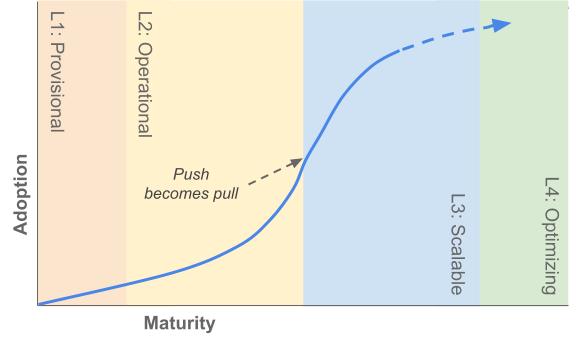 Of note, each additional level of maturity is accompanied by greater requirements for funding and people’s time. Therefore, reaching the highest level should not be a goal in itself. Each level describes qualities that should appear at that stage. Readers must consider if their organization and their current context would benefit from these qualities given the required investment.